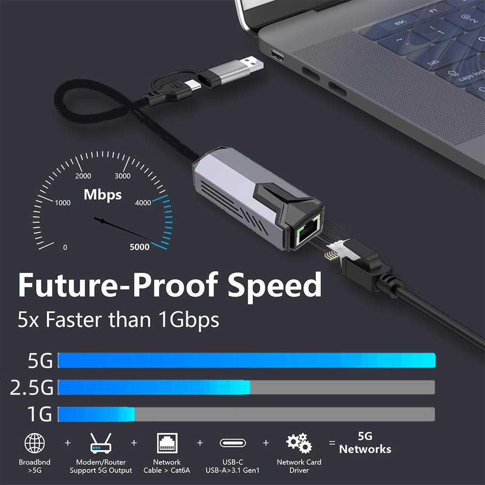 5 Gbit/s kabelgebundener USB-Netzwerkkartenadapter Typ C auf RJ45 LAN USB-C Ethernet-Konverter-Hub für Laptops Win 11 unterstützt 5G/2,5G/1G/100M